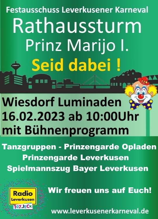 Unterstützt unseren Prinzen bei seinem Vorhaben an Weiberfastnacht den Rathausschlüssel zu erobern von unserem Oberbürgermeister Uwe Richrath. Ab 10 Uhr geht es in den Luminaden los mit einem bunten Bühnenprogramm.